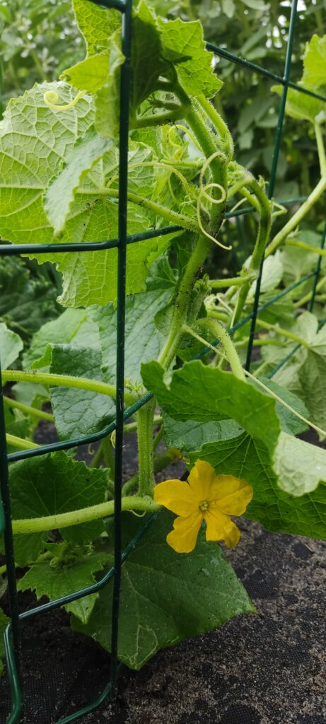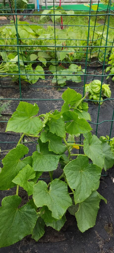 Ogórki posadziłam w dwóch szerokich rzędach. Między nimi postawiłam dwa panele ułożone w kształcie namiotu, dzięki czemu ogórki będą się lepiej piąć. Panel pomógł mi w zachowaniu estetyki w warzywniku, bez niego ogórki rosły na ziemi i wchodziły na inne grządki. Panel w kształcie namiotu jest ułatwieniem również w zbieraniu zwisających owoców.