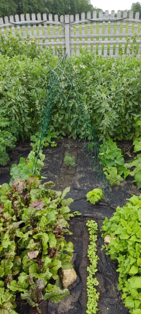 W warzywniku uprawiam głównie bób, fasolę, szpinak, rzodkiewkę, burak, marchewkę, cebulę, jarmuż, brokuł, kalarepę, rukolę, por, ogórki, sałatę.