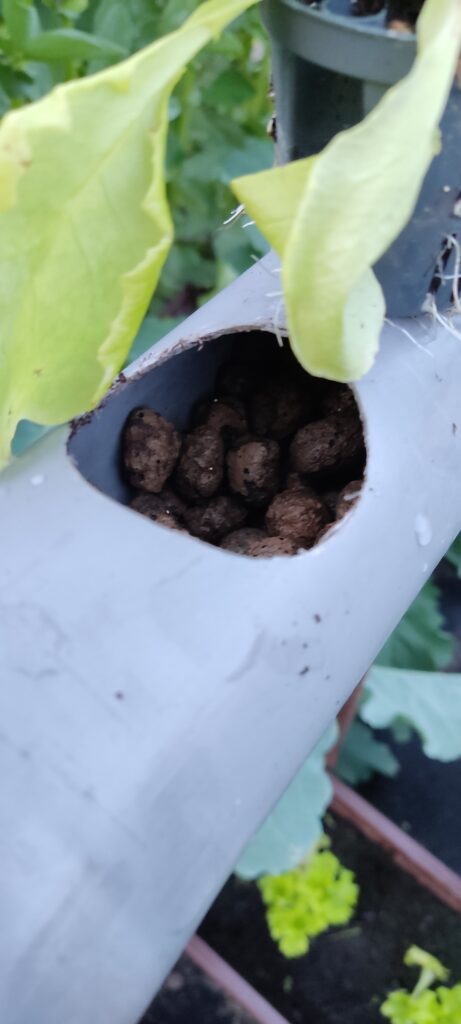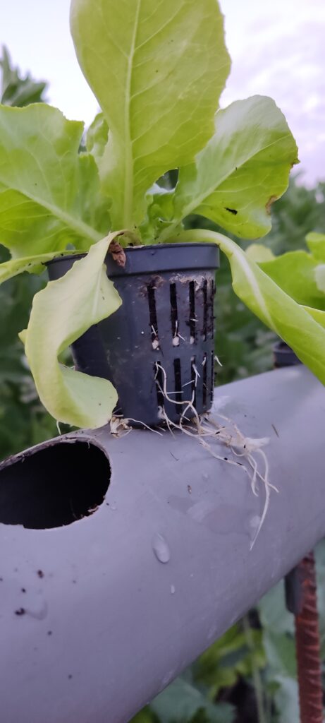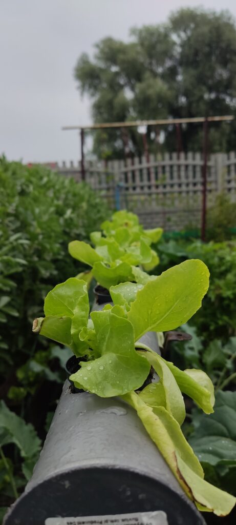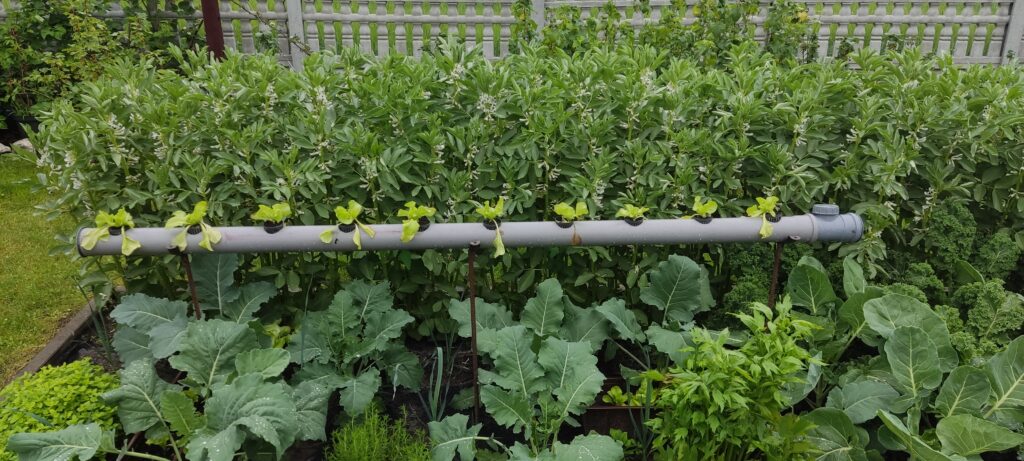 Zakupiłam keramzyt, perlit i małe doniczki do uprawy hydroponicznej oraz kilka drobnych akcesoriów. W rurze fi 70 wywierciłam 10 otworów pod doniczki. Jedna strona rury została zaślepiona, a druga wyposażona w trójnik do kontroli poziomy wody i podlewania. Sadzonki sałaty posadziłam do doniczek wypełnionych keramzytem i perlitem. Rurę wypełniłam do połowy keramzytem, tak by zmniejszyć ilość wody w rurze. W ogródku wbiłam trzy podpórki aby moja uprawa wystawała ponad grządki. Na podpórkach umieściłam rurę i dokładnie wypoziomowałam. W otwory powkładałam doniczki z sadzonkami sałaty, wcześniej sypiąc do każdego otworu miarkę długodziałającego nawozu do upraw hydroponicznych. Do rury nalałam wodę do poziomu zaznaczonego na wskaźnikach z doniczek. Sałata najpierw wyglądała marnie ze względu na upały, ale po kilku pochmurnych dniach przyjęła się i zaczyna rosnąć.