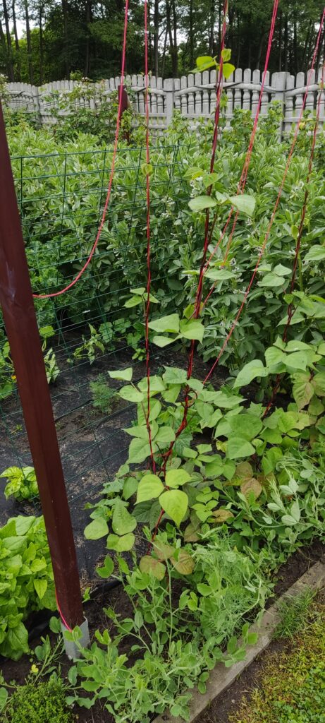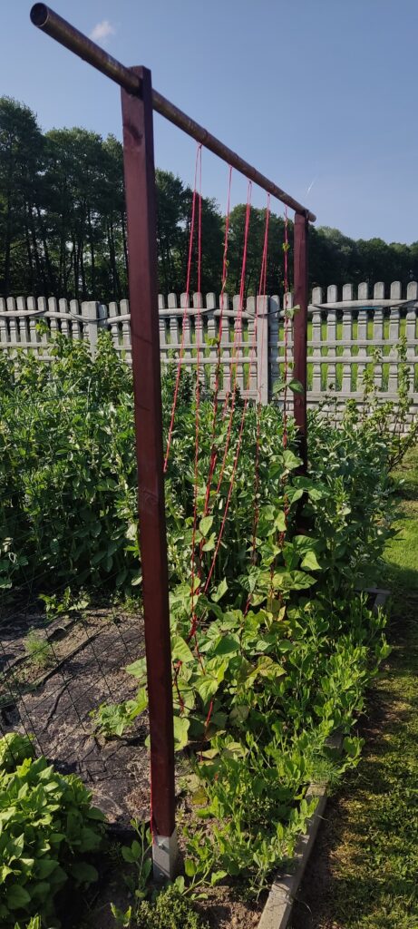 Do prowadzenia fasoli tycznej przygotowałam solidny stelaż z drewnianych kantówek 5 x 5 cm, na których wsparta jest rura fi 40. Całość ma wysokość ok 2 metrów. Do rury przywiązałam kilka sznurków i opuściłam je na fasolę tak, aby fasole same znalazły punkt zaczepienia. Aby drewniane słupy nie gniły w ziemi, są zamontowane w ocynkowanych podstawach do słupów, które dostępne są w każdym markecie budowlanym. Na zimę cała konstrukcja jest chowana do pomieszczenia gospodarczego.