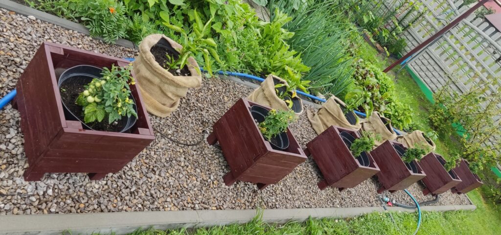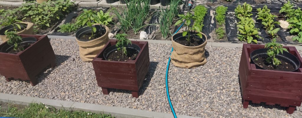 Przed warzywnikiem w donicach znajdują się pomidory koktajlowe i papryki. Donice z pomidorami są włożone do drewnianych skrzyń, a donice z paprykami do worków jutowych.
