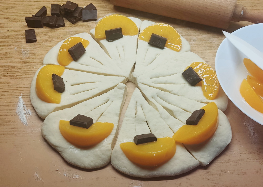 - Na każdym trójkącie robię dwa nacięcia i układam plasterek brzoskwini i kostkę czekolady