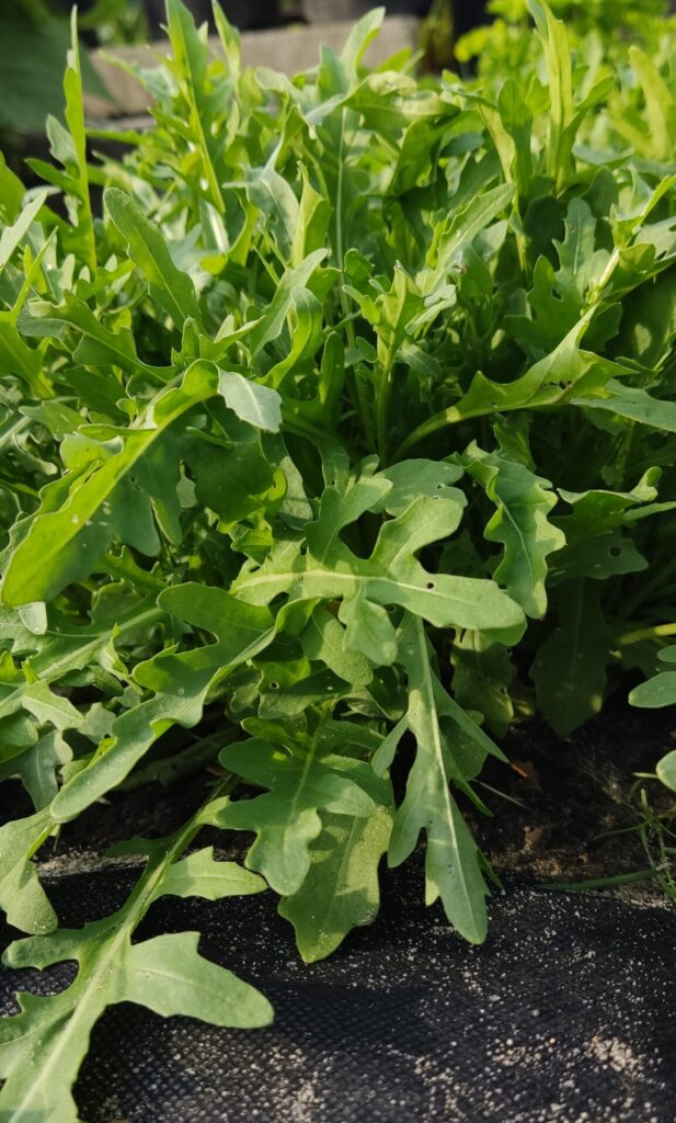 W warzywniku posiałam też rukolę dziką. Uprawiam ją już kilka lat. Obficie wschodzi i nie ma problemów z uprawą. Bardzo ją polecam. Smak ma lekko orzechowy i wyraźnie ostry. Rewelacyjnie nadaje się do sałatek, jako dodatek do pizzy czy zapiekanek. Rukolę uprawiam do późnej jesieni, obrywam tylko liście gotowe do spożycia. Najważniejsze to nie dopuścić do jej przerośnięcia. Przerośnięta rukola jest twarda i włóknista. Jeśli zdąży wykształcić kwiaty, to utraci swój smak i aromat. W połowie sezonu obrywam wszystkie liście, wykopuję korzonki i wysiewam nową rukolę.