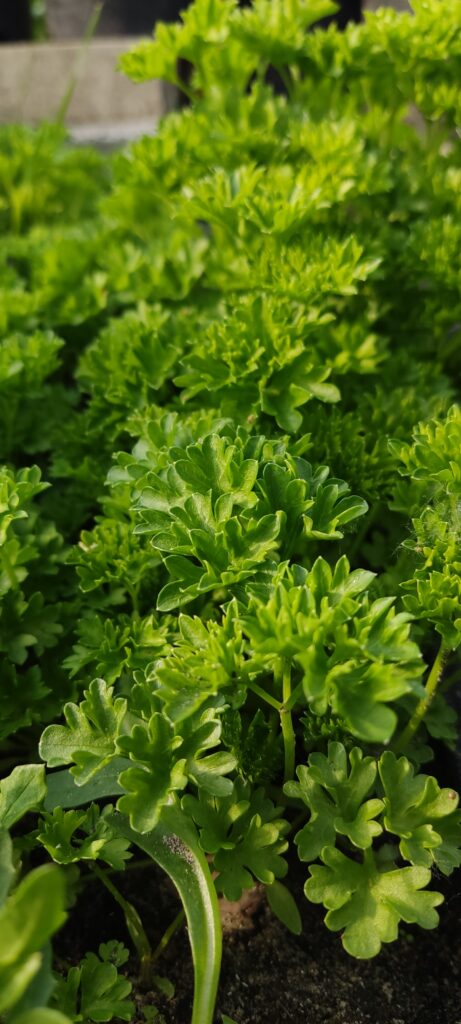 Z pietruszek uprawianych na grządkach, wybrałam naciową o kędzierzawych liściach. Pietruszka naciowa zawiera dużo witaminy C. Żywy kolor gałązek pasuje jako dekoracja potraw, dlatego też często przystrajam nią sałatki, zupy czy dania mięsne. Ze względu na walory smakowe, pietruszka bardzo często gości na moim stole. Pierwsze dojrzałe liście zrywam w czerwcu. Pietruszka dobrze znosi małe przymrozki. Czasami jak zima jest łagodna to wychodzę do ogrodu by urwać kilka jej listków do obiadu.