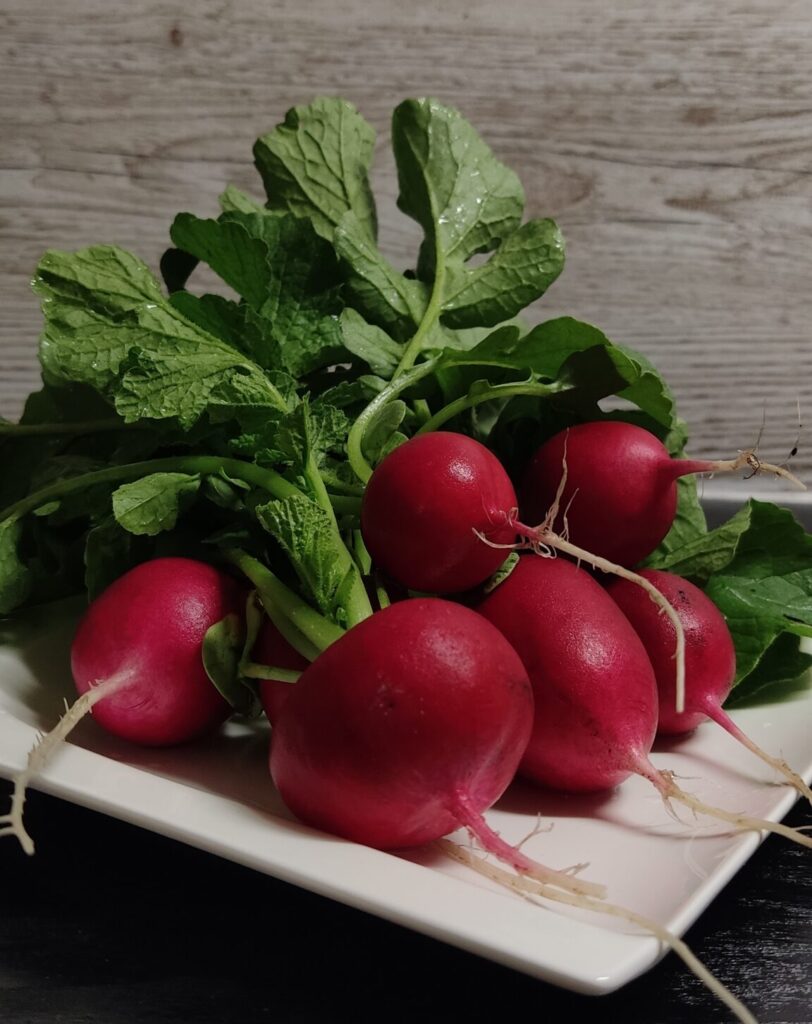 Pierwsze na moim talerzu królowały rzodkiewki, które w tym roku urosły do znacznych rozmiarów i co najważniejsze, były przepyszne. Nawet rzodkiewki, które zbyt długo rosły na grządce po zerwaniu nie były przerośnięte, włókniste, ani uszkodzone przez szkodniki. Ogromną rolę w uzyskaniu tak okazałych i smacznych rzodkiewek odegrał kompost, którym zasiliłam warzywnik jeszcze przed wysianiem i wysadzeniem warzyw. Grządki podlewane są co dziennie od momentu wysiania, przez co rzodkiewki nie popękały i nie wniknęły w głąb patogeny chorobotwórcze. Po wyrwaniu całej grządki dojrzałych rzodkiewek, szybko wysiałam kolejne.