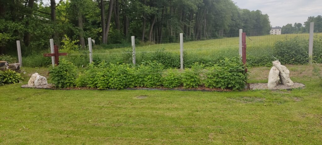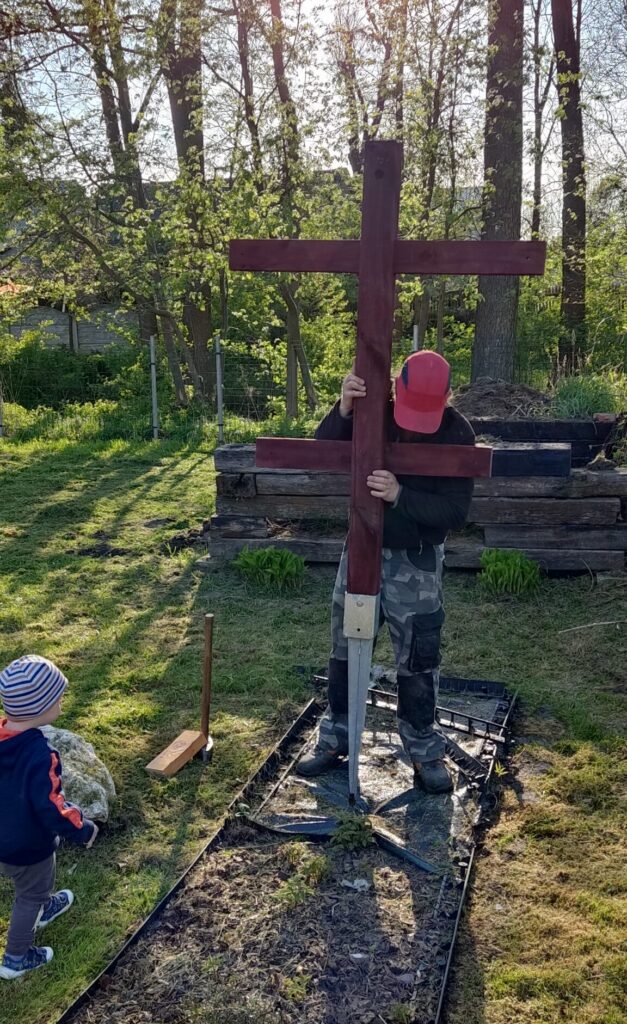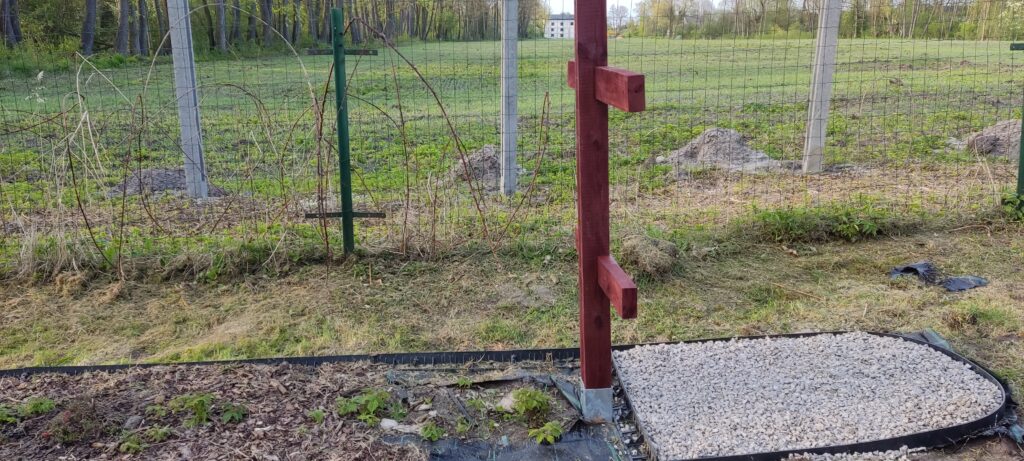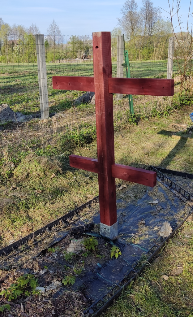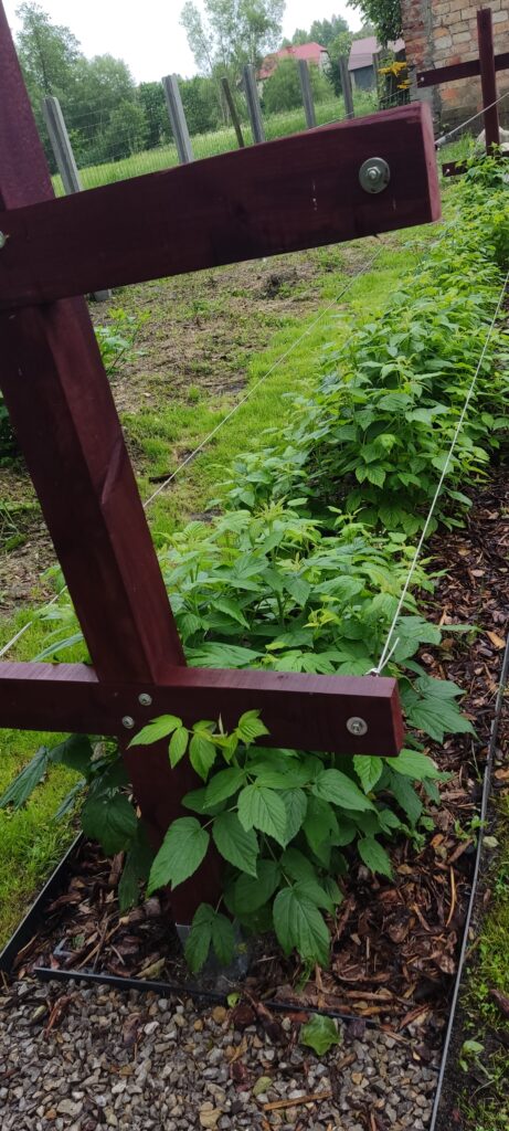 Mój mąż przygotował mi dwa drewniane “krzyże”, które zostały ustawione na początku i na końcu malinowego poletka. Aby drewno nie zgniło w ziemi do zamocowania zastosowaliśmy ocynkowane podstawy słupa.