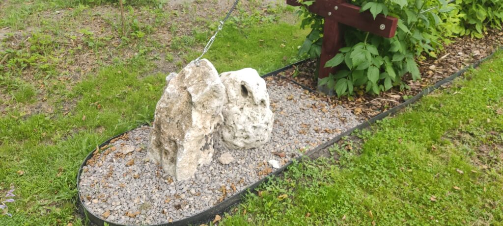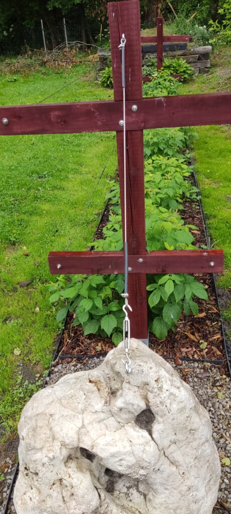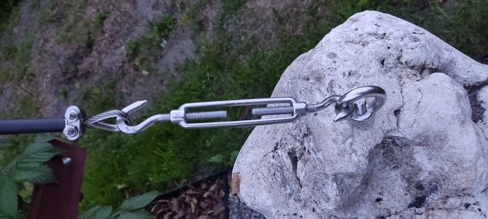Ciężar lin, a później również ciężar opierających się o nie pędów spowodowałby zapadnięcie się konstrukcji do środka. Aby temu zapobiec na górze każdego z słupów zamocowany został odciąg poprowadzony do ozdobnego wapiennego kamienia, umieszonego na grysie. Regulacja naciągu lin oraz odciągów wykonana jest za pomocą śrub rzymskich. Aby nikt nie poranił się przy zbiorze owoców na końce lin założyłam i zgrzałam koszulki termokurczliwe.