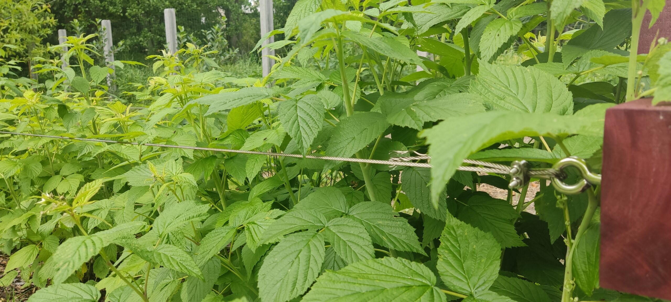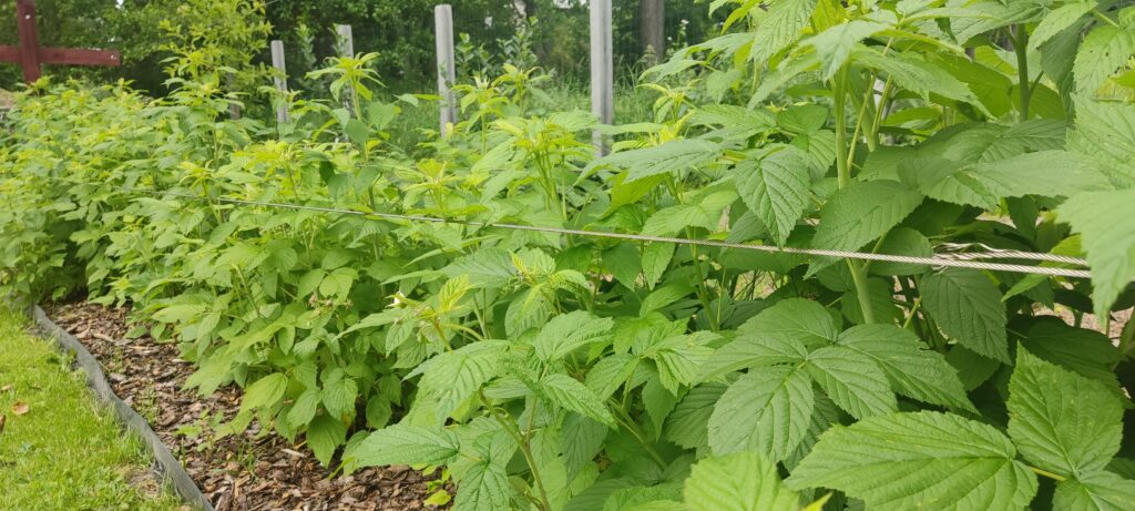 Od teraz już nie muszę związywać malin, jeśli zauważę jakiś niepokorny pęd wychodzący poza linki wkładam go tam z powrotem. Maliny chociaż są jeszcze małe mają już pojedyncze owoce. Na razie nie ma z nimi większych problemów. Do jesieni jednak sporo czasu zostało. Na pewno dam znać jak sprawdziły się linki po zbiorze owoców.
