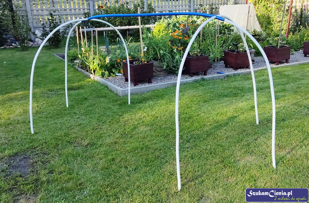 Z rurki PEX zrobiłam dwa łuki o szerokości 130cm i wysokości 150cm oraz dwa pół łuki o szerokości 40cm i wysokości 150 cm.