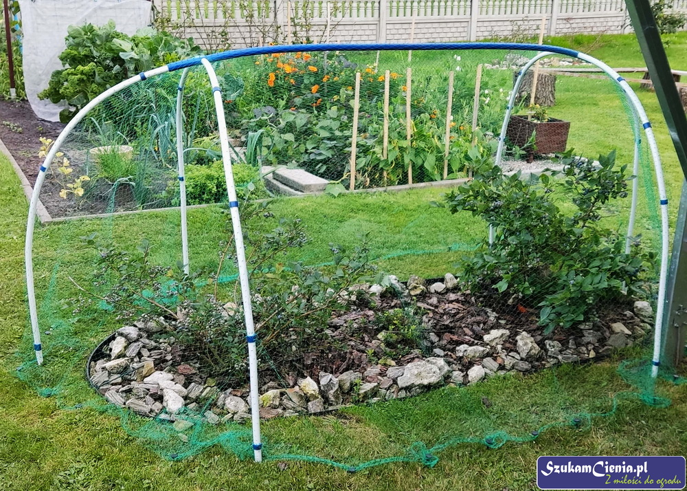 Moja rabata ma wymiary 2m x 1m. Krzaki borówek amerykańskich mają wysokość ok 80cm. Postanowiłam wiec zbudować stelaż i odsunąć siatkę od krzaków, tak aby żaden z latających gości w moim ogrodzie nie był wstanie dosięgnąć do owoców.