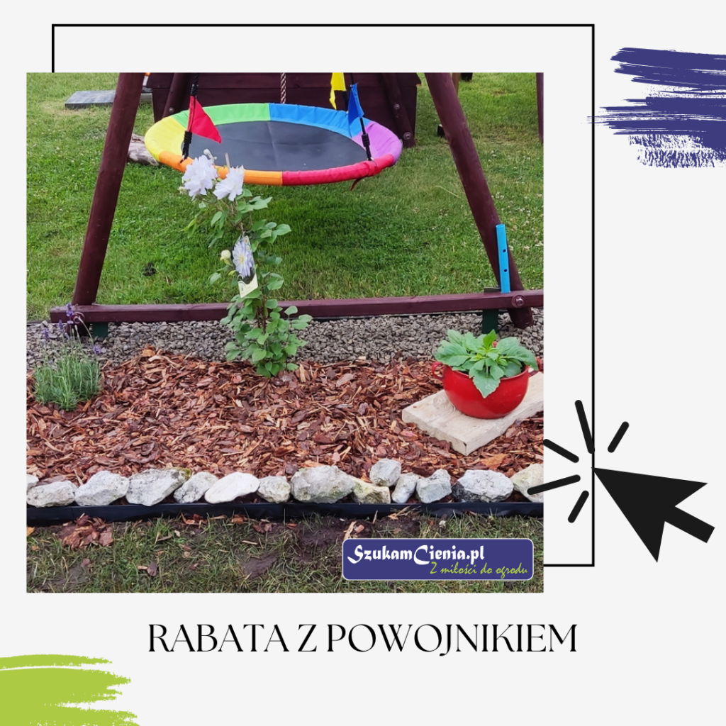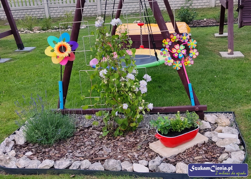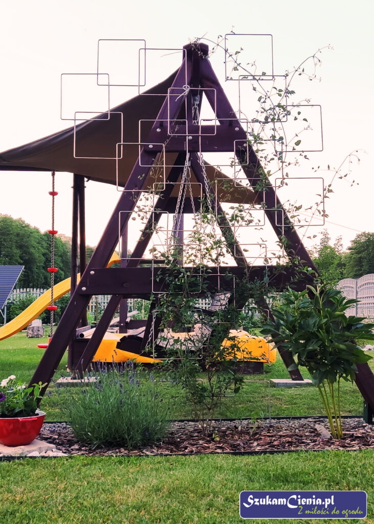 Poniżej przesyłam aktualne zdjęcia rabaty z kratownicą na powojnik, wykonane po roku od jej założenia. Znajdziesz tu zdjęcia dwóch rabat przy huśtawkach: jednej, gdzie powojnik Diamond Ball pięknie zakwitł, oraz drugiej, z tego samego dnia, gdzie jeszcze czekam na zakwitnięcie powojnika Sweet Summer Love