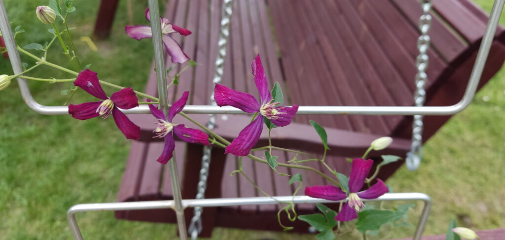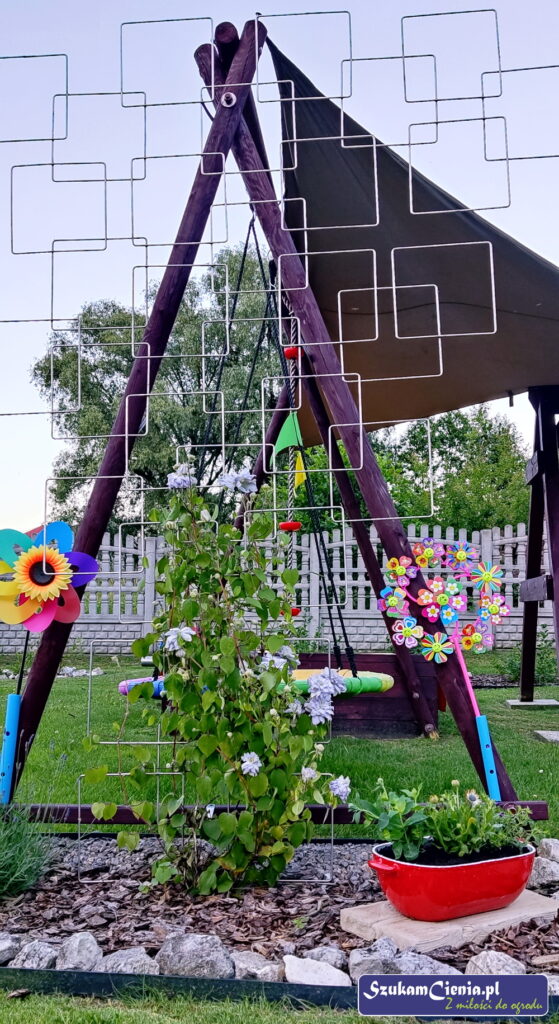 Tak naprawdę to zaczęło się od stworzenia kącika z huśtawkami w moim ogrodzie. Huśtawki ułożone są w literę L a pomiędzy ich zewnętrznymi wierzchołkami rozwieszony jest żagiel przeciwsłoneczny. Jednak ciągle czegoś mi tam jeszcze brakowało… kwiatów, a zwłaszcza bardziej pnączy. W tym celu z mężem stworzyliśmy dwie rabaty przy huśtawkach z powojnikami. Posadzenie powojników wiązało się z koniecznością zapewnienia rusztowania dla nich. I tak powstał pomysł na budowę własnej kratownicy dla clematisów.