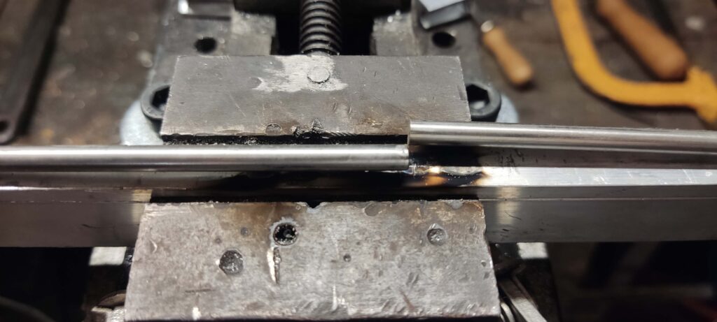 Moim celem było skrócenie końców prętów tak, aby osiągnąć równomierne i estetyczne złączenie, przy jednoczesnym unikaniu pozostawienia zbyt dużej luki między nimi. Duża luka utrudni spawanie, a zbyt ciasno spasowane pręty mogą się nie zespawać w całym przekroju.
