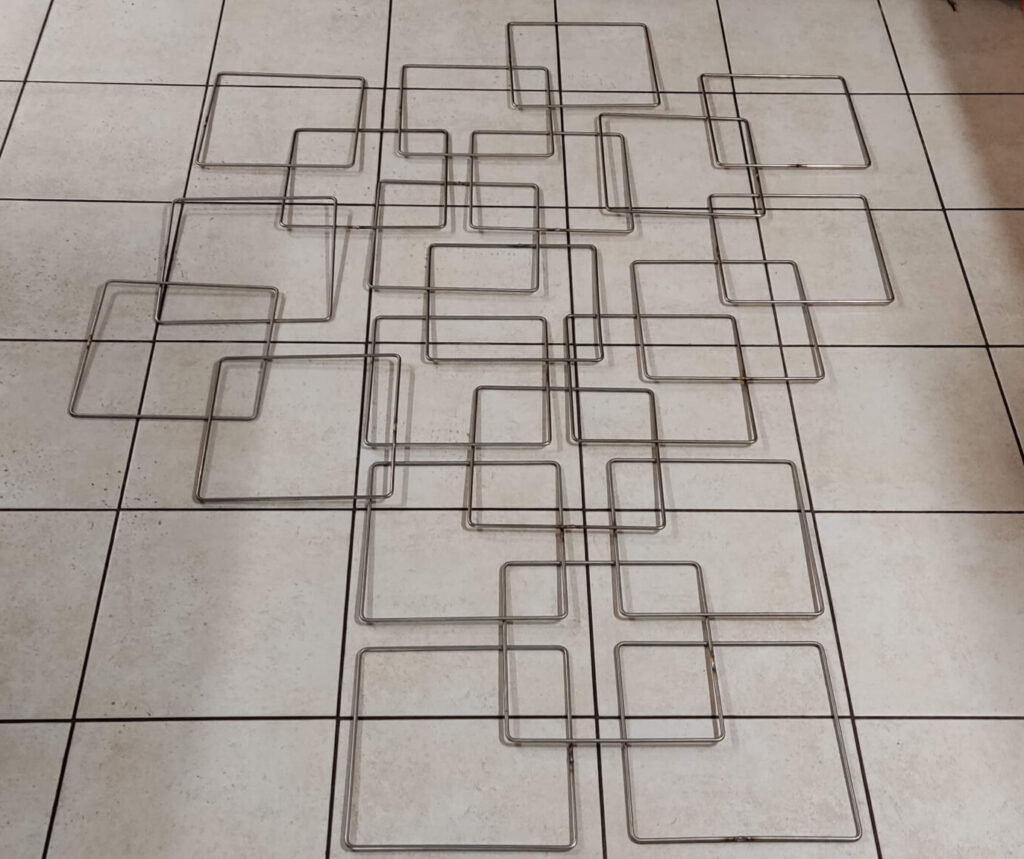 Dobór materiału był prosty – postawiłam na stal nierdzewną. Nie trzeba jej malować, można ją wypolerować na błysk lub pozostawić delikatnie szczotkowaną, jest łatwo dostępna. Na składzie kupiłam więc pręty o średnicy 5mm (to dobry kompromis między stabilnością konstrukcji, a łatwością kształtowania), Poprosiłam o docięcie surowych sztang na długość 100cm, moje kwadraty będą więc miały boki o długości 25cm.