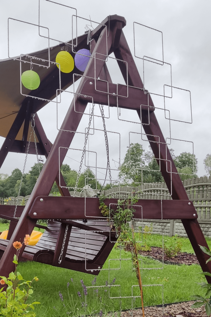 - Kratownica od spodu opiera się na gruncie, a od góry przykręciłam do poprzeczki huśtawki.