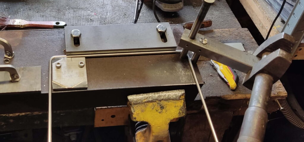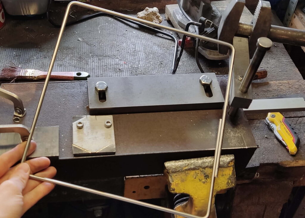 Pręty były długie i proste, a ja potrzebowałam zrobić z nich foremne kwadraty, na dodatek podobne do siebie. Aby to uczynić odkopałam w szpargałach męża prostą giętarkę do prętów. Wygięłam pierwsze dwie sztuki na próbę. Po pomiarach wprowadziłam kilka korekt i zaznaczyłam na giętarce punkty odniesienia, bazując na nich wygięłam pozostałe 25 sztuk. Ostatecznie kwadraty mają boki o długości 24cm, a pozostałą zakładkę obcinam w następnym kroku.