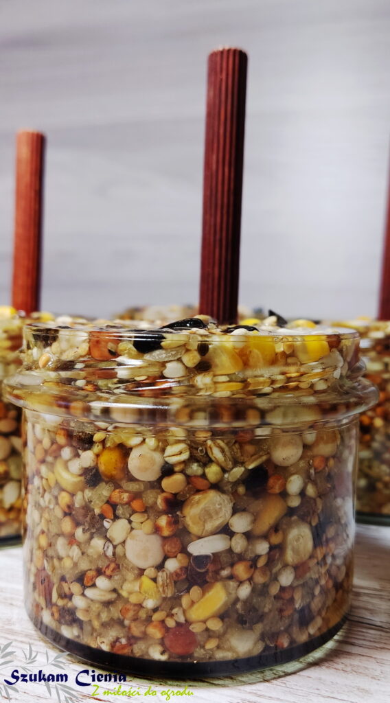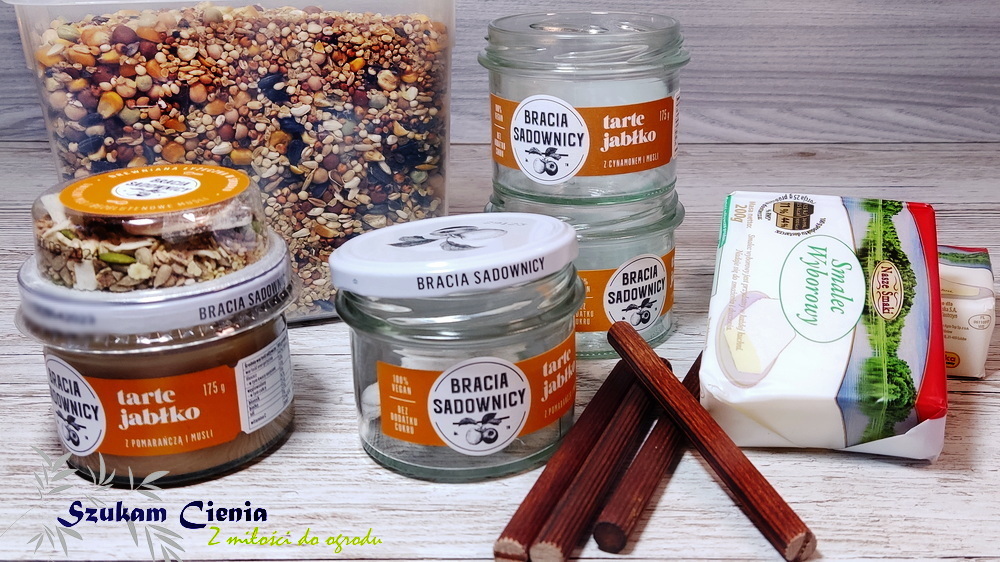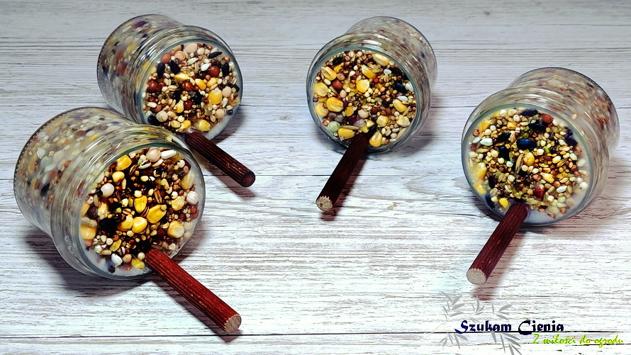 Jak już miałam słoiczki, następnie przygotowałam sypki pokarm dla ptaków, smalec i patyczki, dzięki którym ptaki będą mogły stać i spokojnie dziabać sobie ziarenka.