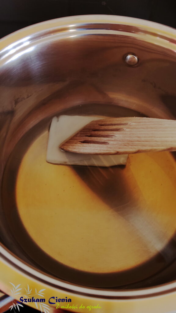 Zalane smalcem nasiona delikatnie ubiłam łyżką i z jednej strony włożyłam patyk aż do samego dna.