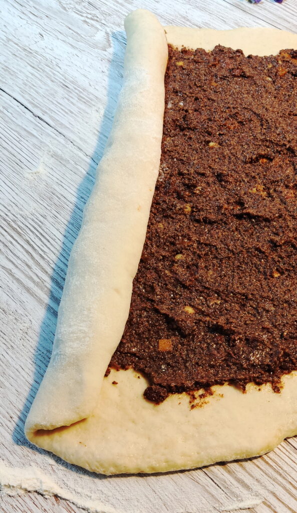 - Następnie zwiń ciasto wzdłuż dłuższego boku, by nadzienie nie wydostało się na zewnątrz.
