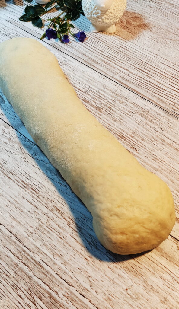 - Rozwałkuj wyrobione ciasto na prostokąt o wymiarach 40×30 cm, tworząc delikatny placek o grubości około 0,5 cm.