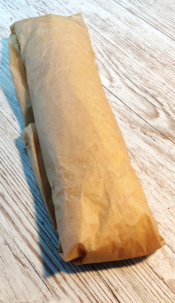 - Zwiniętą roladę delikatnie owiń w papier do pieczenia, zapewniając, by był wystarczająco duży, aby zawinąć roladę dwa razy, a także podwinąć boczne krawędzie.