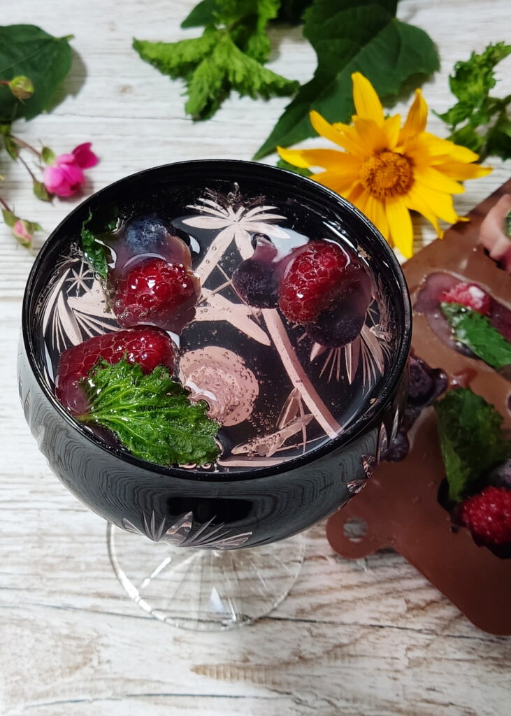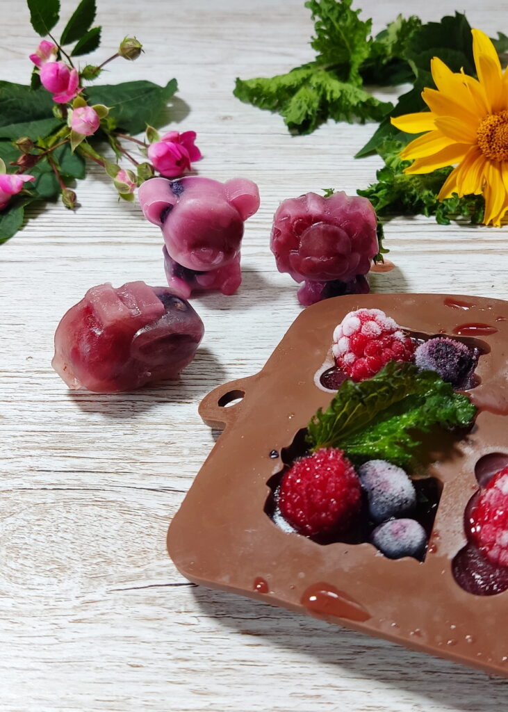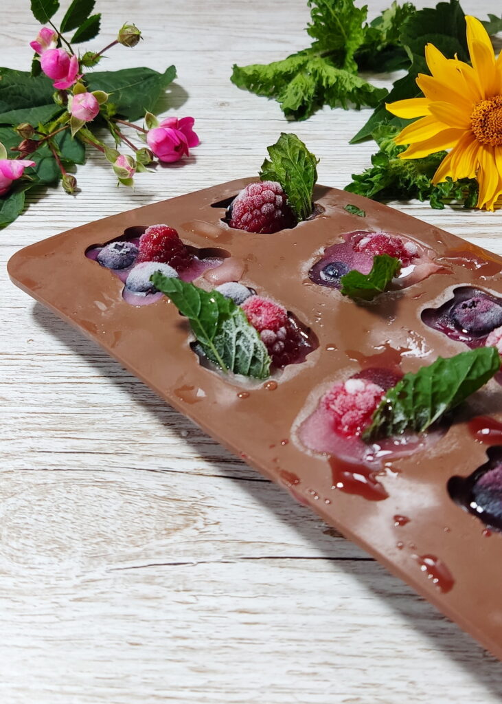 Do niektórych foremek wylałam syrop z mięty, a do innych syrop z malin. Później mieszałam dwa rodzaje zamrożonych kostek w jednym napoju. Efekt? Smakowa eksplozja!