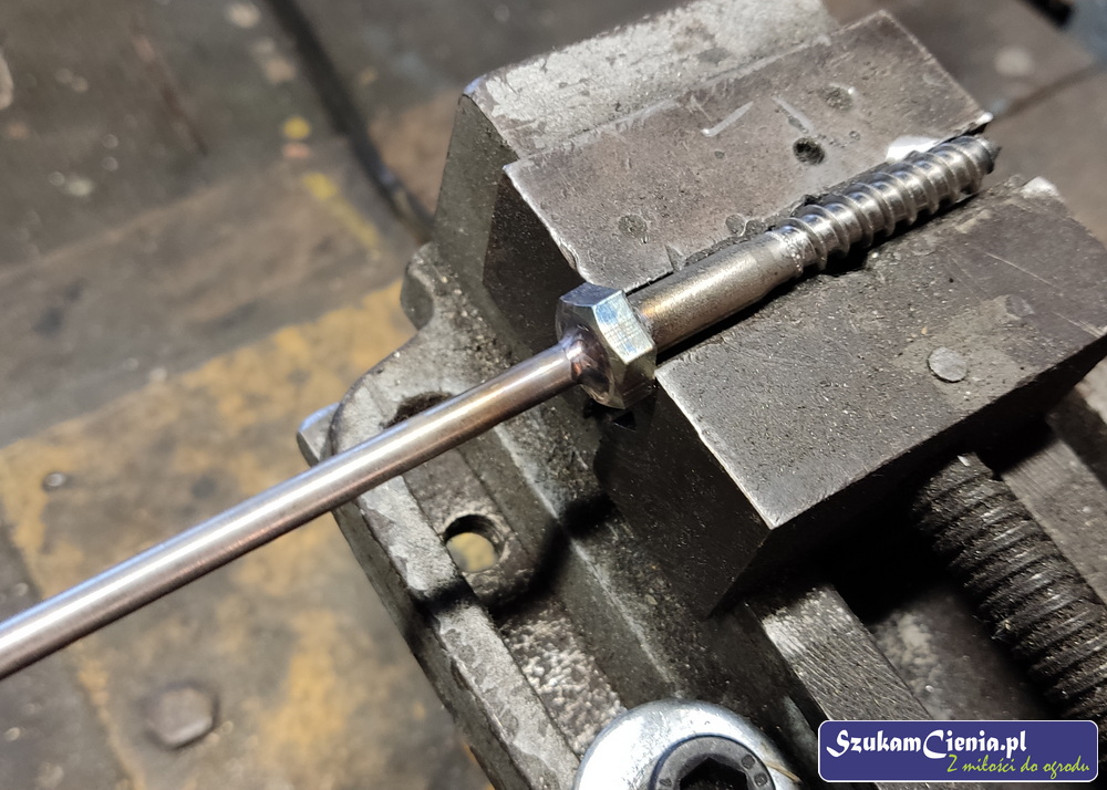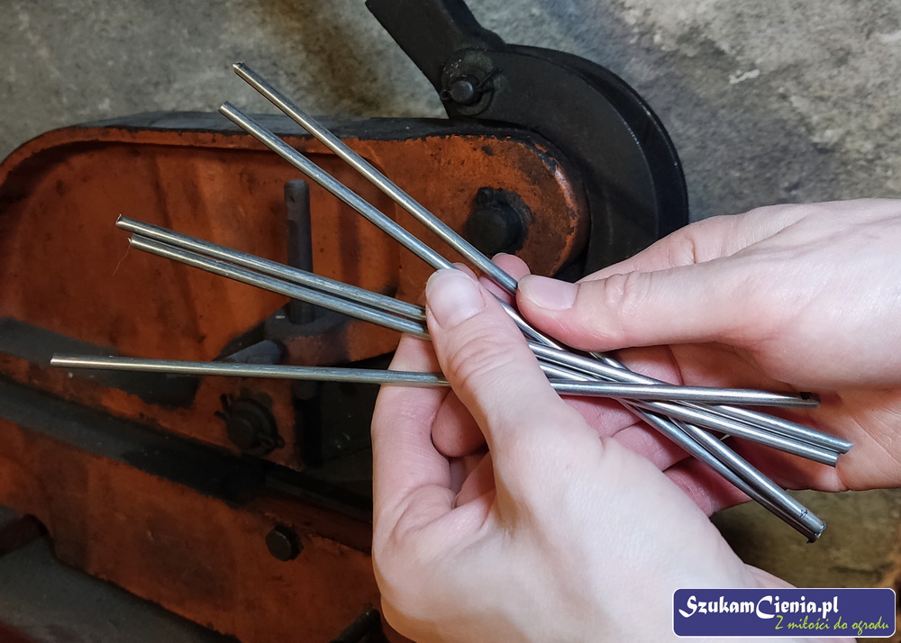 Gdy miałam już gotowy komplet wkrętów, przyspawałam do nich pręt o długości 100 cm.