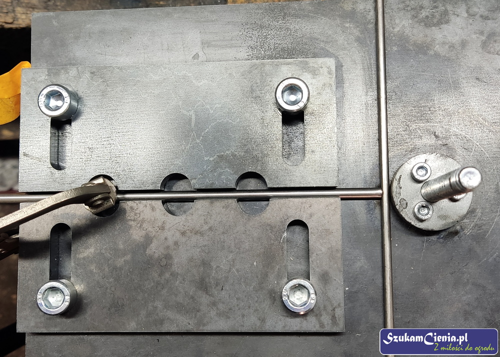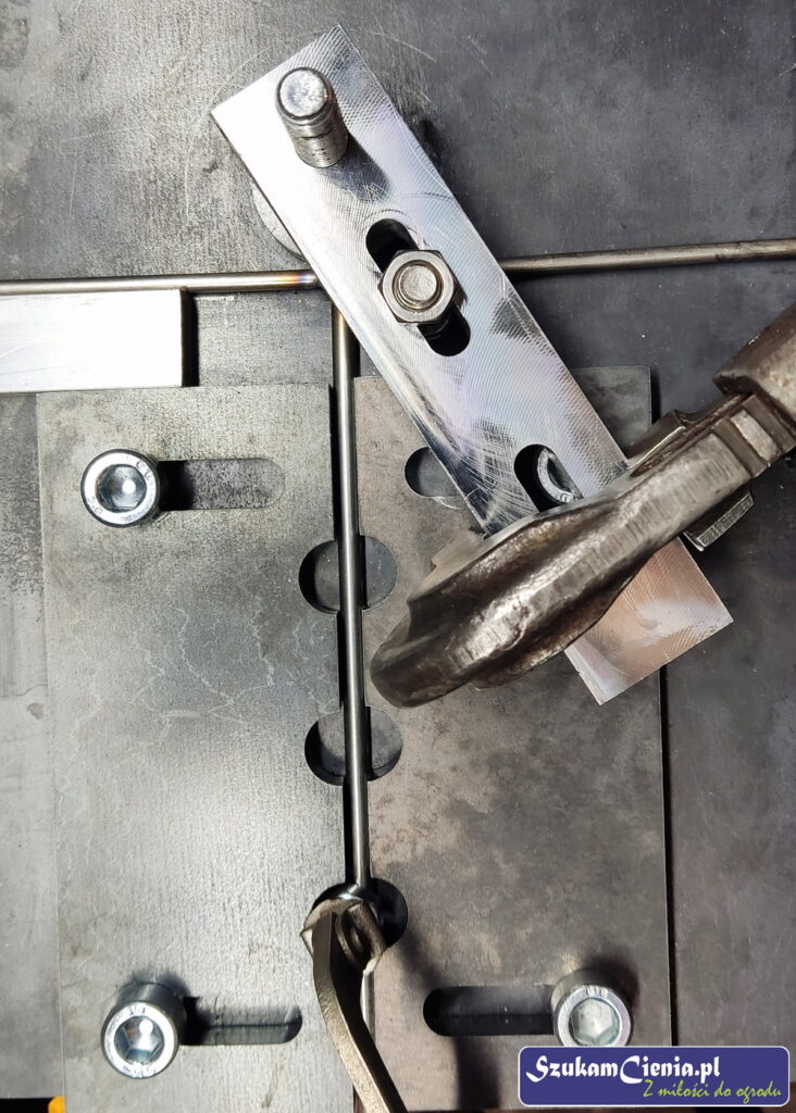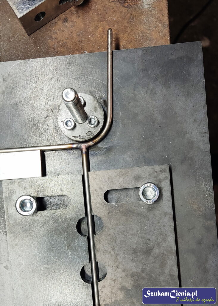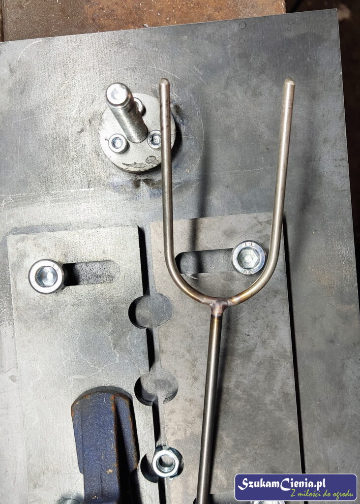 Z jednego z moich poprzednich projektów pozostał mi przyrząd do mocowania, spawania i gięcia prętów. Do łącznika przyspawałam wcześniej docięty kawałek pręta.