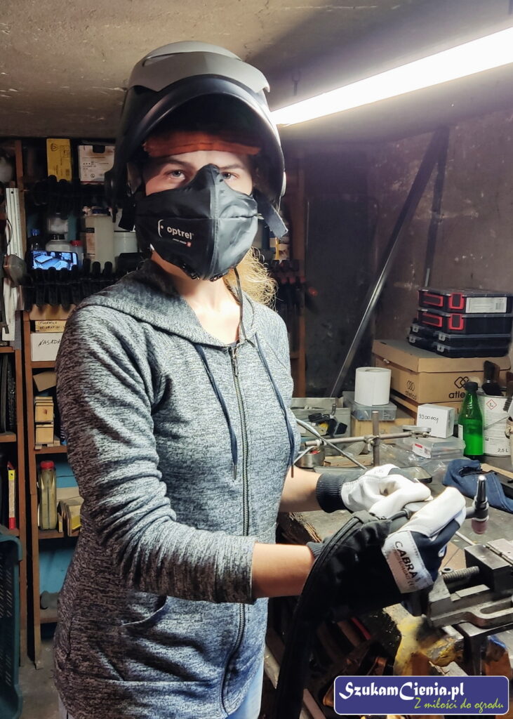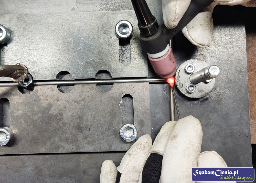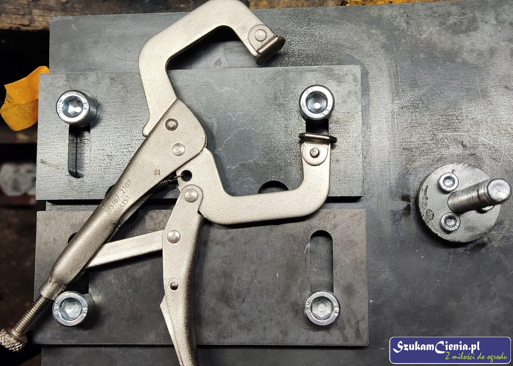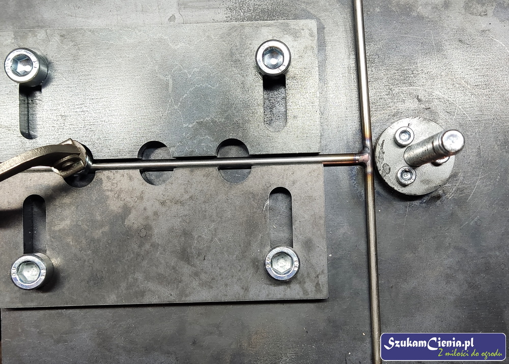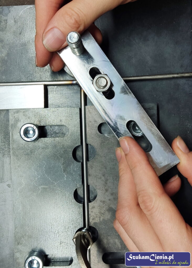 Z jednego z moich poprzednich projektów pozostał mi przyrząd do mocowania, spawania i gięcia prętów. Do łącznika przyspawałam wcześniej docięty kawałek pręta.