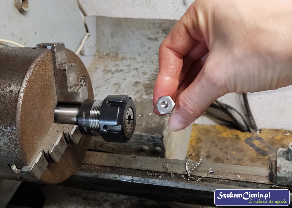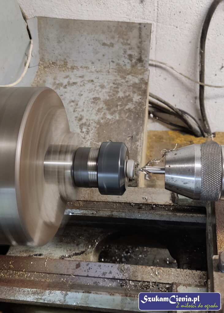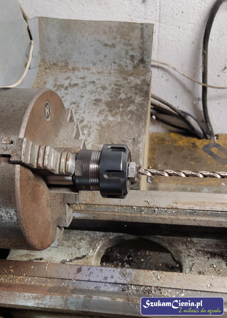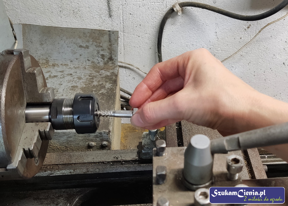W oferowanych w sklepach widelcach nie podoba mi się sposób mocowania na wcisk, dlatego postanowiłam połączyć moje widelce z rączką za pomocą wkrętów. Aby ułatwić sobie przyspawanie wkręta do widelca, na tokarce nawierciłam otwór prowadzący.