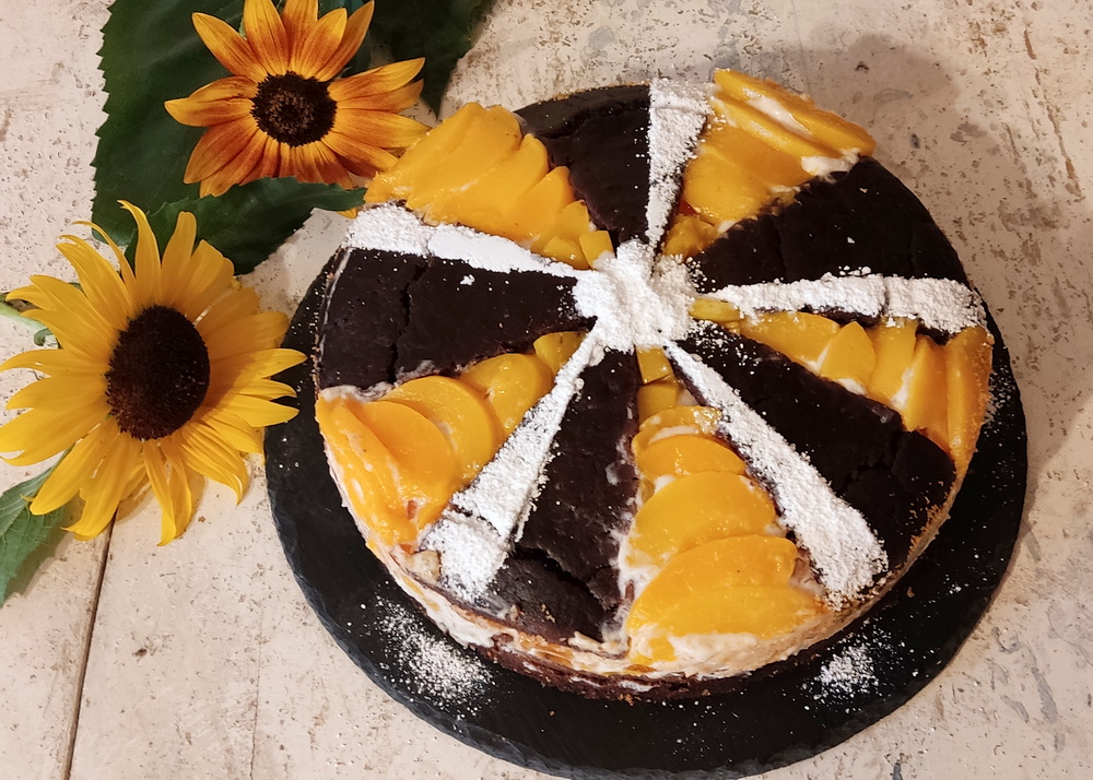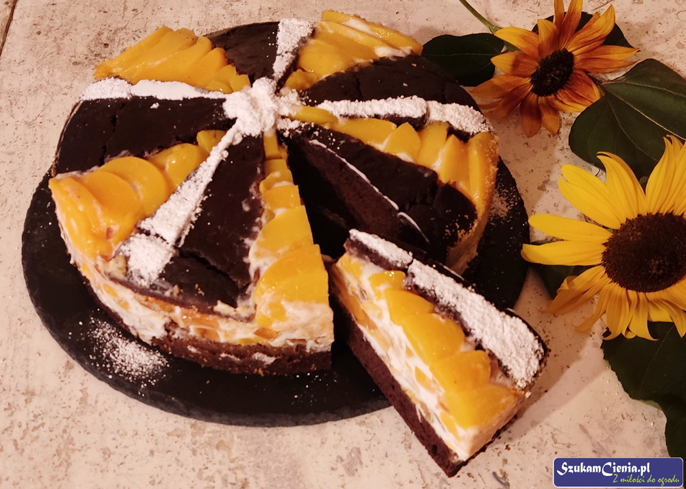 • Do kremu wkładaj trójkąty ciasta, a pozostałą część kremu przyozdób pokrojonymi w plastry brzoskwiniami.