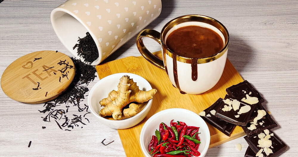 We pour boiling water over the black tea and steep for 3-4 minutes. We heat the chocolate in a saucepan over low heat or in a double boiler. Pour the infusion and hot chocolate into a cup. Add finely grated ginger, a pinch of ground chili, and a few almond flakes.